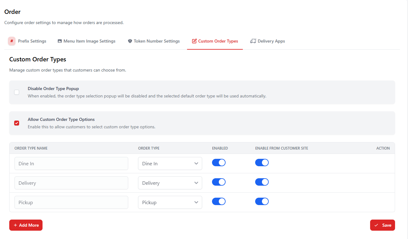 | Allow Custom Order Type Options | Allows restaurants to create custom order types. |