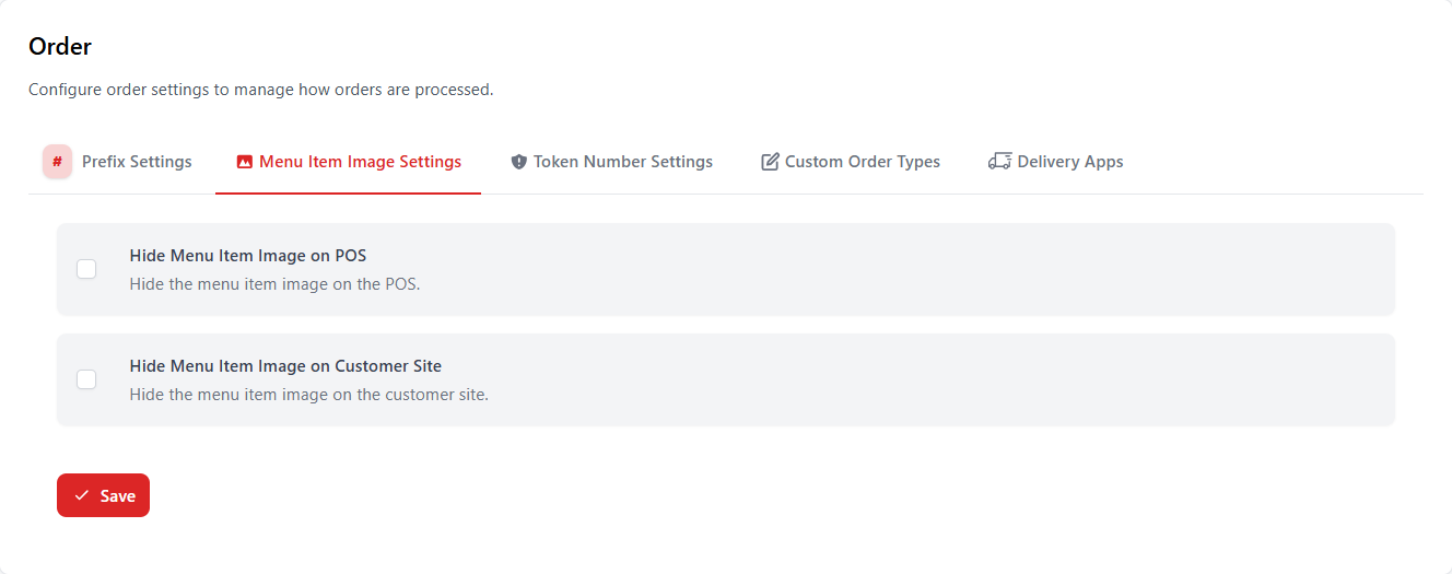 Menu Item Image Settings control whether food item images appear in the POS interface and on the customer ordering site.
