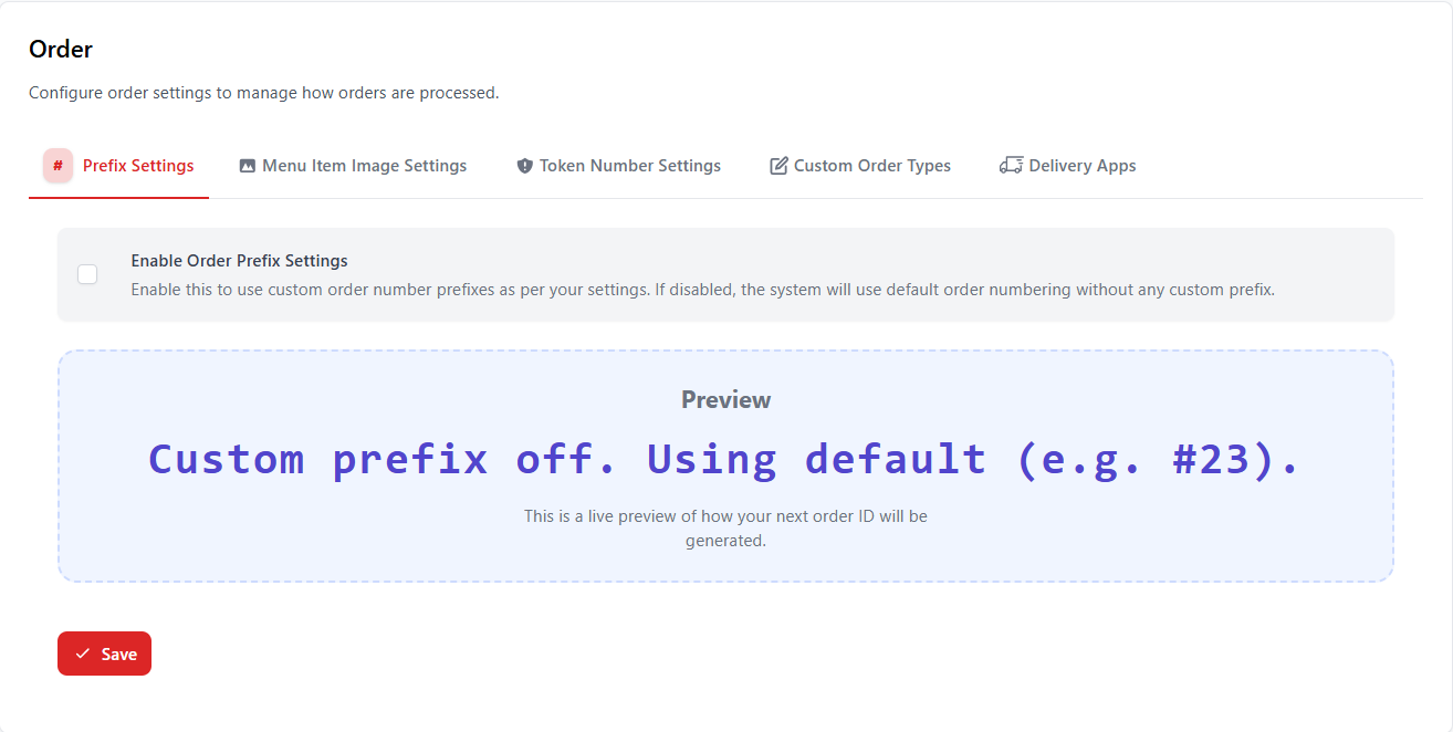 Prefix Settings allow restaurants to customize how order numbers appear in the system. Instead of using only numeric values, administrators can add custom prefixes to identify orders easily.