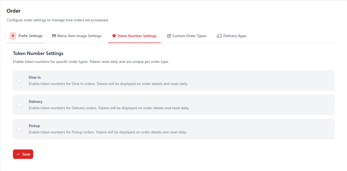 Token numbers help restaurants manage order queues efficiently. Tokens reset daily and can be enabled for specific order types.